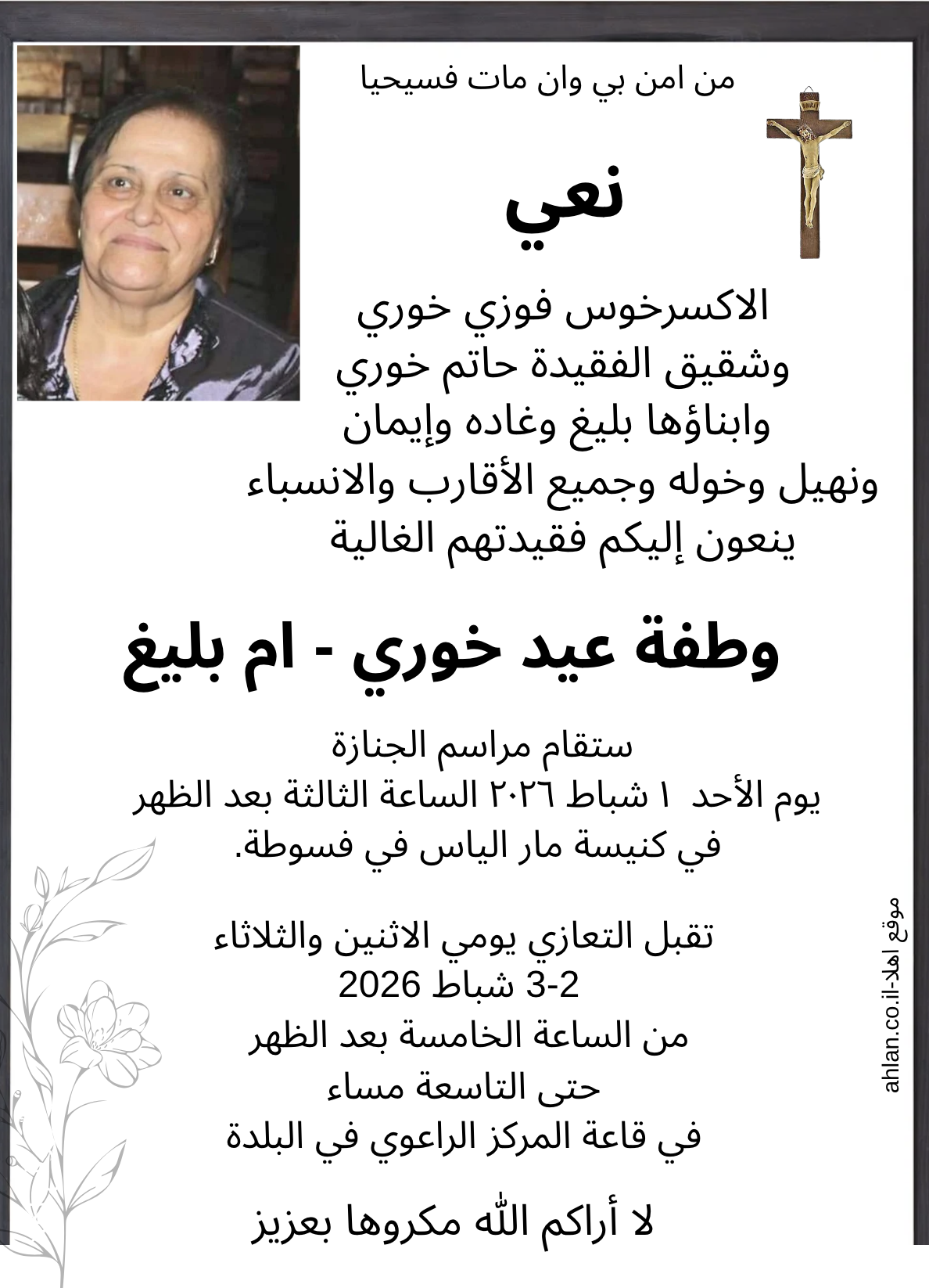 فسوطة: وفاة الفاضلة ام بليغ خوري وطفة عيد خوري