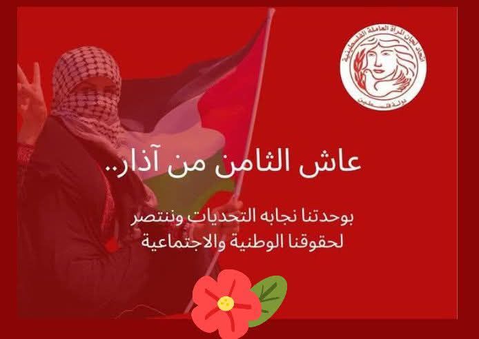 يأتي الثامن من آذار في بلادنا هذا العام في ظل تصاعد العدوان الصهيوني - الامبريالي البربري على شعبنا ومواصلة حرب الإبادة الجماعية الهمجية منذ أكثر من عامين متواصلين ، وفي ظل العدوان الوحشي على ايران وعلى لبنان واستهداف النساء والاطفال في المدارس والمستشفيات .