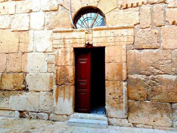 * أما في الوسط فيقع (باب الدخول إلى الكنيسة) وهو خشبي أثري مرمم مزين بحشوات فنية منحوتة..