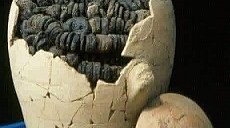 تم العثور على جرة عمرها 3100 عام مليئة بالتين المحروق مربوطة ببعضها البعض بخيوط، في عقرون، فلسطين...