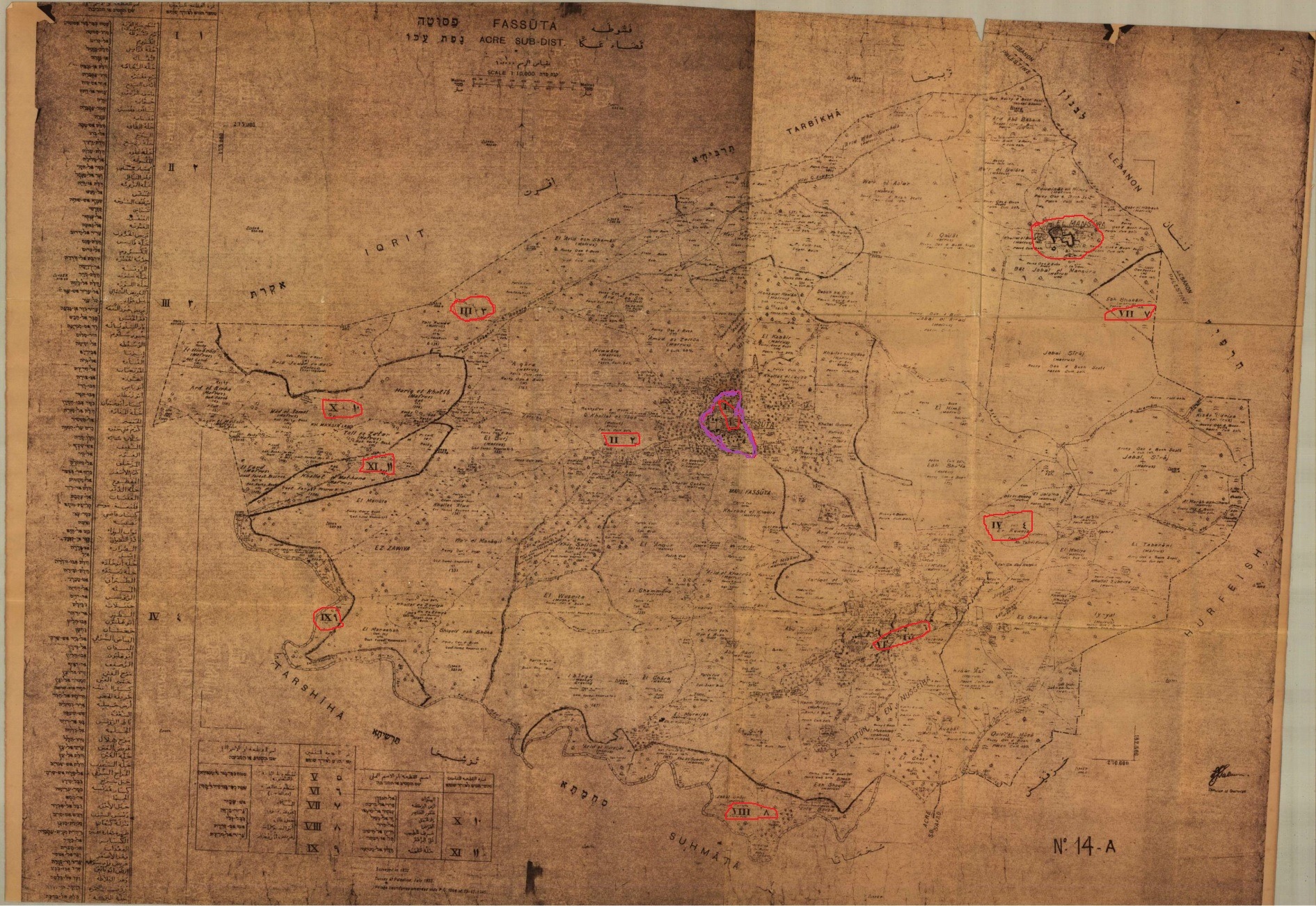 من خلال "بحبشتي" في "الإرشيف الإسرائيلي" على إنترنت، عثرت على هذه الصورة المرفقة لخارطة لأراضي "فسّوطة" بأسمائها التي اشتهرت بها عند أهلها في مطلع الثلاثينيات من القرن العشرين. فالخارطة تقسم "أراضي فسوطه" وما حولها الى "مناطق" مرقّمة باللاتينية والعربية (أرقام محاطة بالأحمر)، ثم تدرج في طرف الصورة الأيسر، جدولاً بأسماء هذه "الأراضي" و"المناطق" التي تقع فيها. هذا الجدول، بالإضافة الى أسماء الأماكن على الخارطة، ليس واضحاً جداً. لذلك قمت بنقل الأسماء الواردة (تبييضها) في آخر هذا "البوست"، مع اعترافي بأن هناك اكثر من نصف الأسماء التي لا أعرفها والخطأ في كتابتها وارد جداً. لذلك، فإن هذا الجدول بحاجة الى "تدقيق وتحقيق" بعد، من خلال عرضه على بعض "الختيارية" أو العارفين من أبناء فسوطه الذين يعرفون أين تقع هذه الأماكن بالضبط.