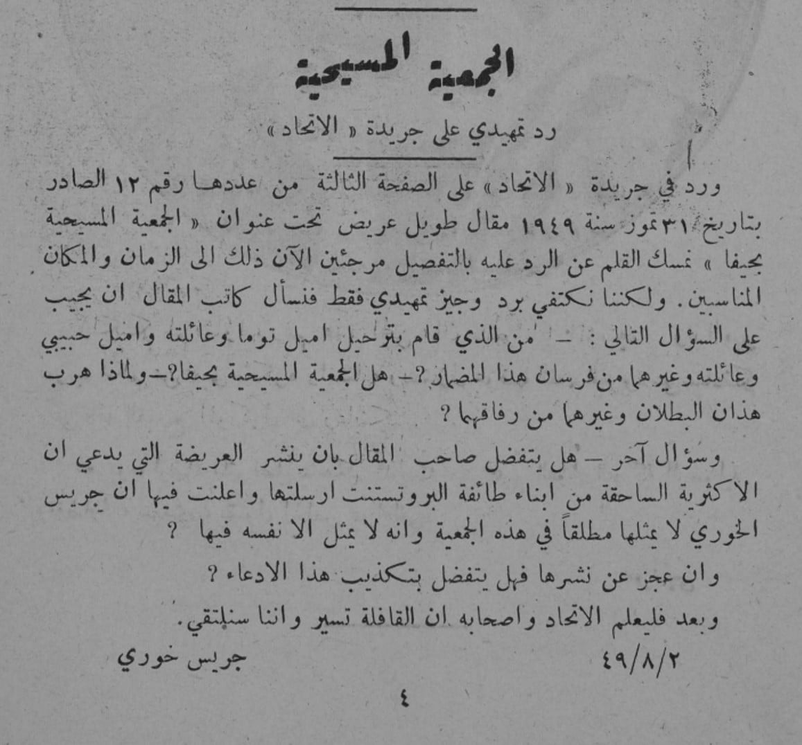 نشرت صحيفة الاتحاد (31.7.49) مقالا مطولا بعنوان "الجمعية المسيحية بحيفا" تتهم المطران حكيم الذي عاد من لبنان بدون الأطفال الذي قام بتهجيرهم خلال النكبة، وانه يعمل على إعادة تأسيس "الجمعية المسيحية"، التي تعمل بإرشاد المطران ومديرها رجل الاعمال فكتور خياط. وانها ساهمت في النكبة وساعدت القوات البريطانية بإجلاء عرب حيفا (براً للناصرة وبحراً لعكا ولبنان)، كما هو الحال مع "الجمعية الإسلامية" برئاسة رشيد الحاج إبراهيم.