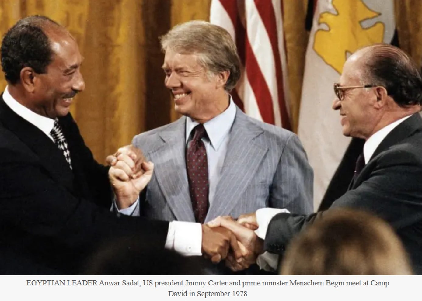 عام 1979 يوقع السادات على المعاهدة التي شملت انسحاب إسرائيل من سيناء مقابل مرور السفن الإسرائيلية في قناة السويس واعتبار مضيق تيران وخليج العقبة ممرات مائية دولية، وتبادل السفراء بين الدولتين.