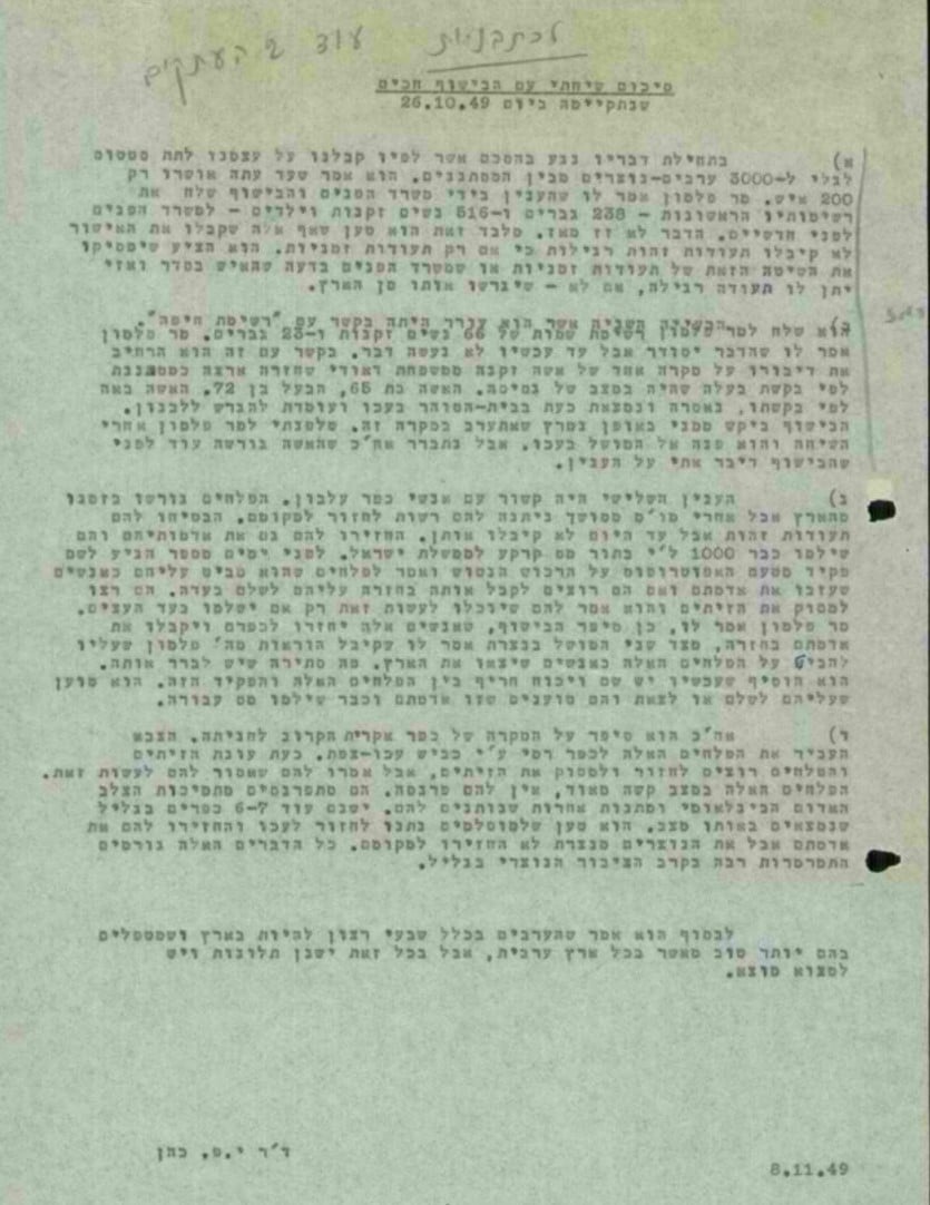 الدكتور كوهن يلتقي بالمطران حكيم يوم 26.10.49 ويقدم ملخصاً للحديث الذي دار بينهما: