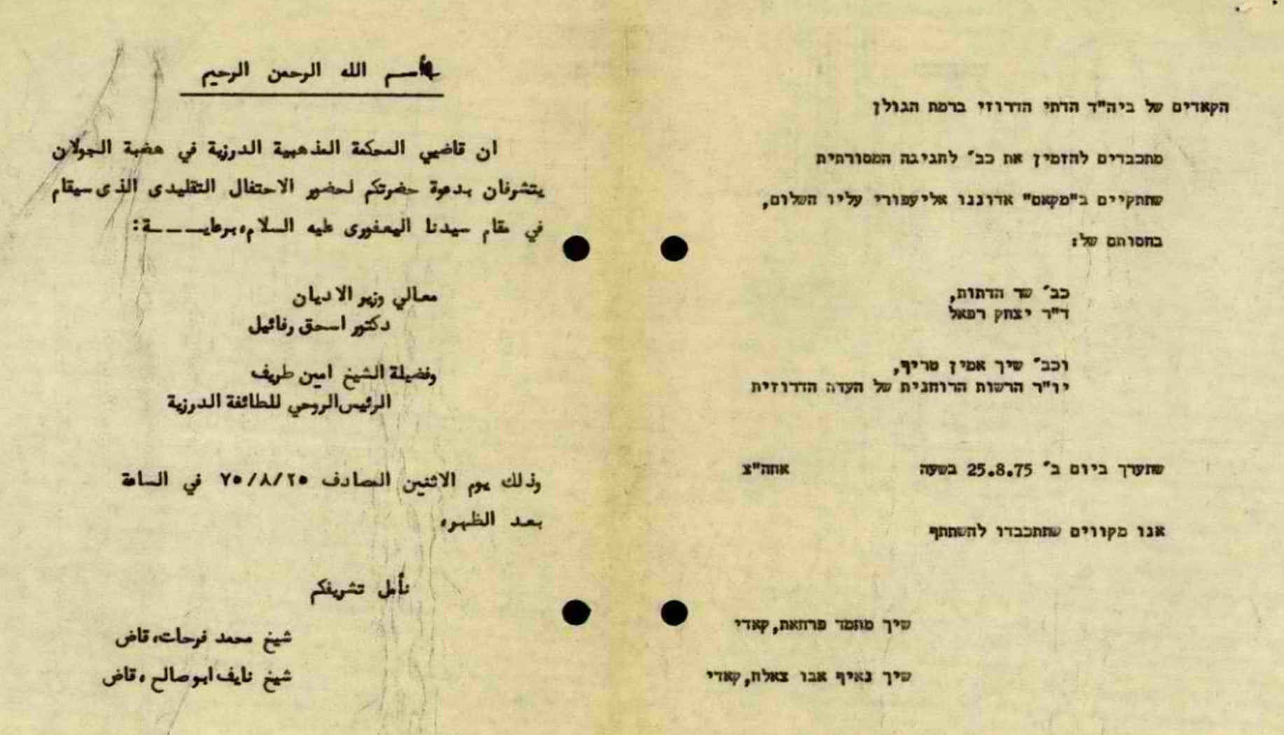 وفي عام 1975، يقوم قضاة الطائفة في هضبة الجولان بدعوة شخصيات مختلفة لمقام اليعفوري عليه السلام، بمشاركة وزير الأديان والشيخ طريف.