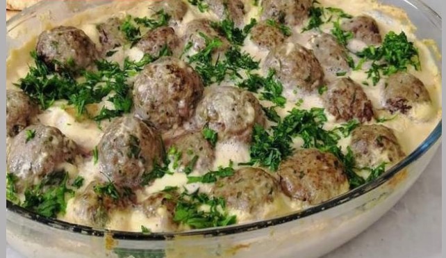 في صينية نوزع كرات اللحمة المحمرة ونسكب عليها صوص الطحينة وندخلها الفرن على درجة حرارة 180 لمدة 20 دقيقة