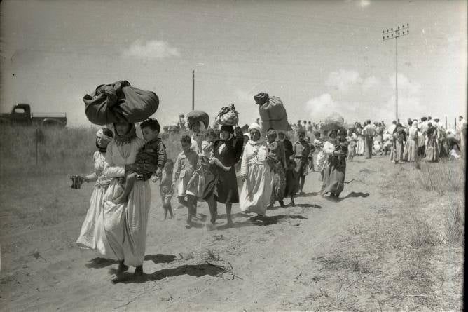 الصورة للتهجير في الطريق المتجهة شرقا من الطنطورة نحو قرية الفريديس التي استقر فيها بعض أهالي الطنطورة في حين تشتت الباقون في شتى بقاع الأرض .
