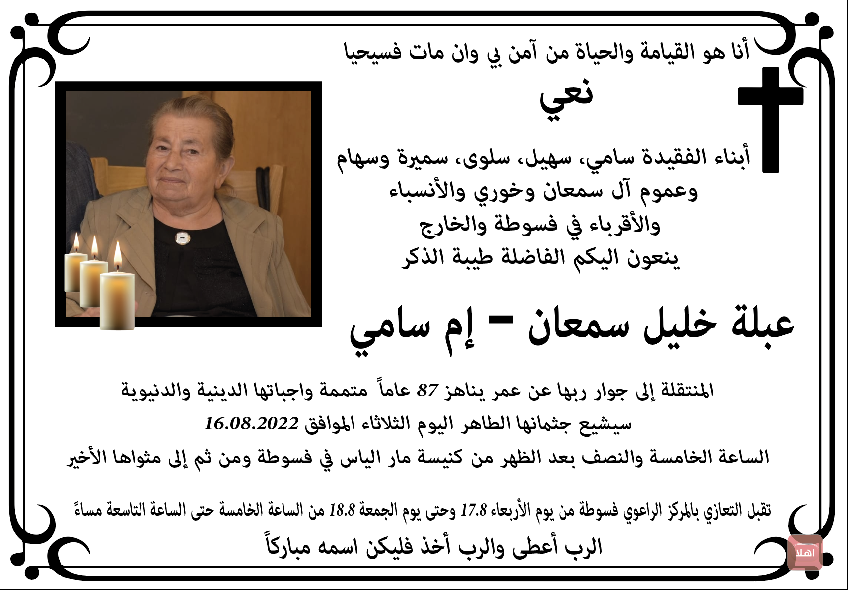 أنا هو القيامة والحياة من آمن بي وان مات فسيحيا نعي أبناء الفقيدة سامي، سهيل، سلوى، سميرة وسهام وعموم آل سمعان وخوري والأنسباء والأقرباء في فسوطة والخارج ينعون اليكم الفاضلة طيبة الذكر عبلة خليل سمعان – إم سامي المنتقلة إلى جوار ربها عن عمر يناهز 87 عاماً متممة واجباتها الدينية والدنيوية سيشيع جثمانها الطاهر اليوم الثلاثاء الموافق 16.08.2022 الساعة الخامسة والنصف بعد الظهر من كنيسة مار الياس في فسوطة ومن ثم إلى مثواها الأخير تقبل التعازي بالمركز الراعوي فسوطة من يوم الأربعاء 17.8 وحتى يوم الجمعة 18.8 من الساعة الخامسة حتى الساعة التاسعة مساءً الرب أعطى والرب أخذ فليكن اسمه مباركاً
