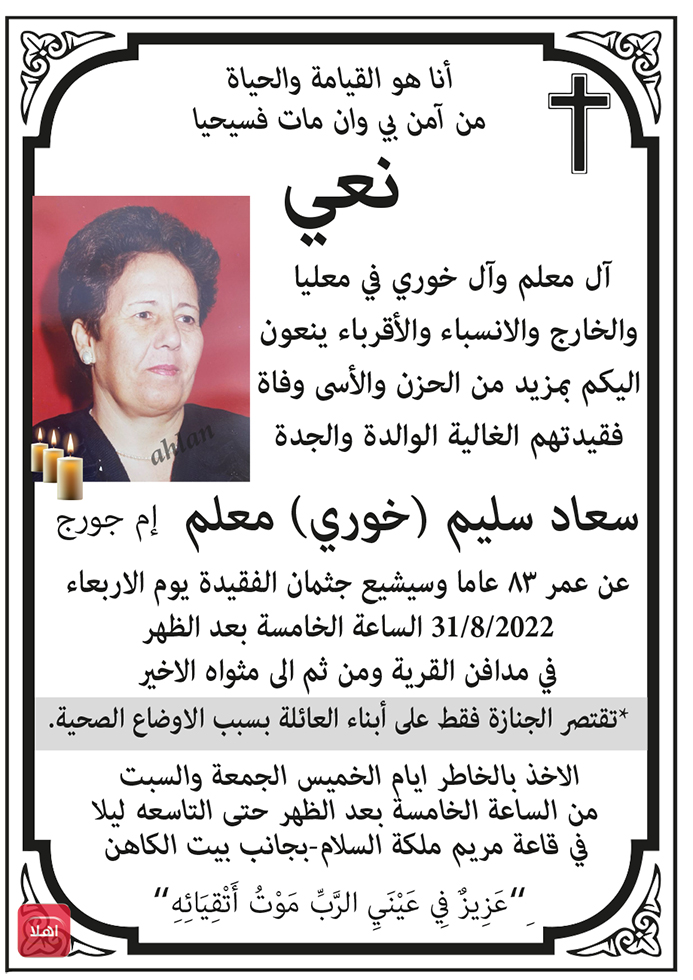 معليا: وفاة الفاضلة سعاد خوري معلم ام جورج
