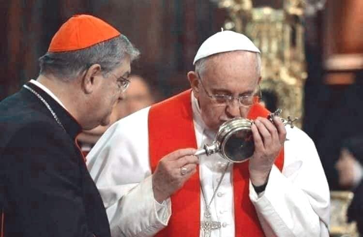 أما خلال زيارات الباباوات السابقين الى مدينة نابولي فلوحظ أن الدم كان يبقى جامداً في إنائه الزجاجي..وقد عَلّق كاردينال نابولي كريشينسيو سِيبّه في حينه أي عام 2015 على الموضوع بالقول: يبدو أن القديس جينَّارو، راضٍ عن البابا فرنسيس وأسلوب حياته..