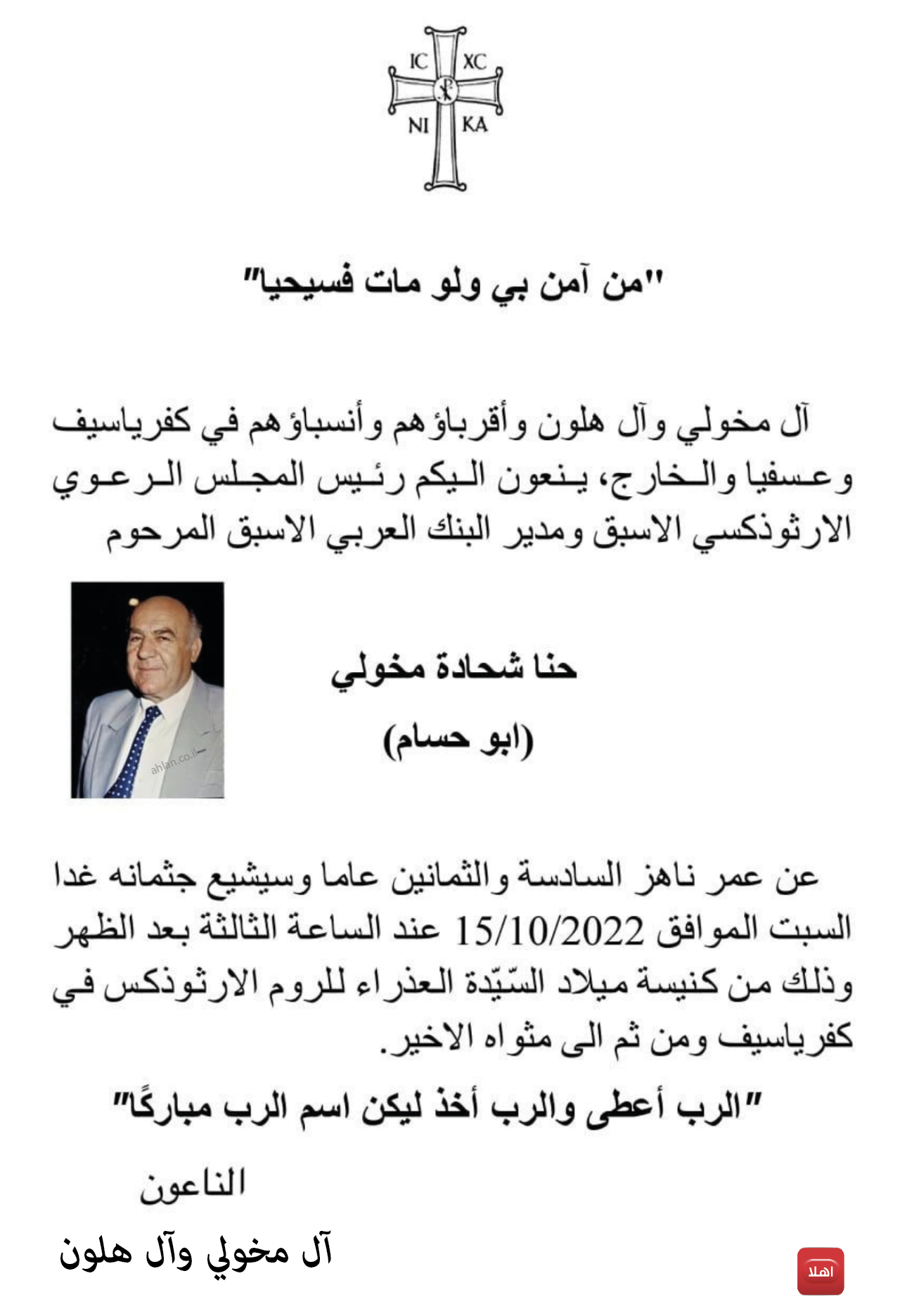 كفرياسيف:وفاة الفاضل حنا شحادة مخولي-ابو حسام