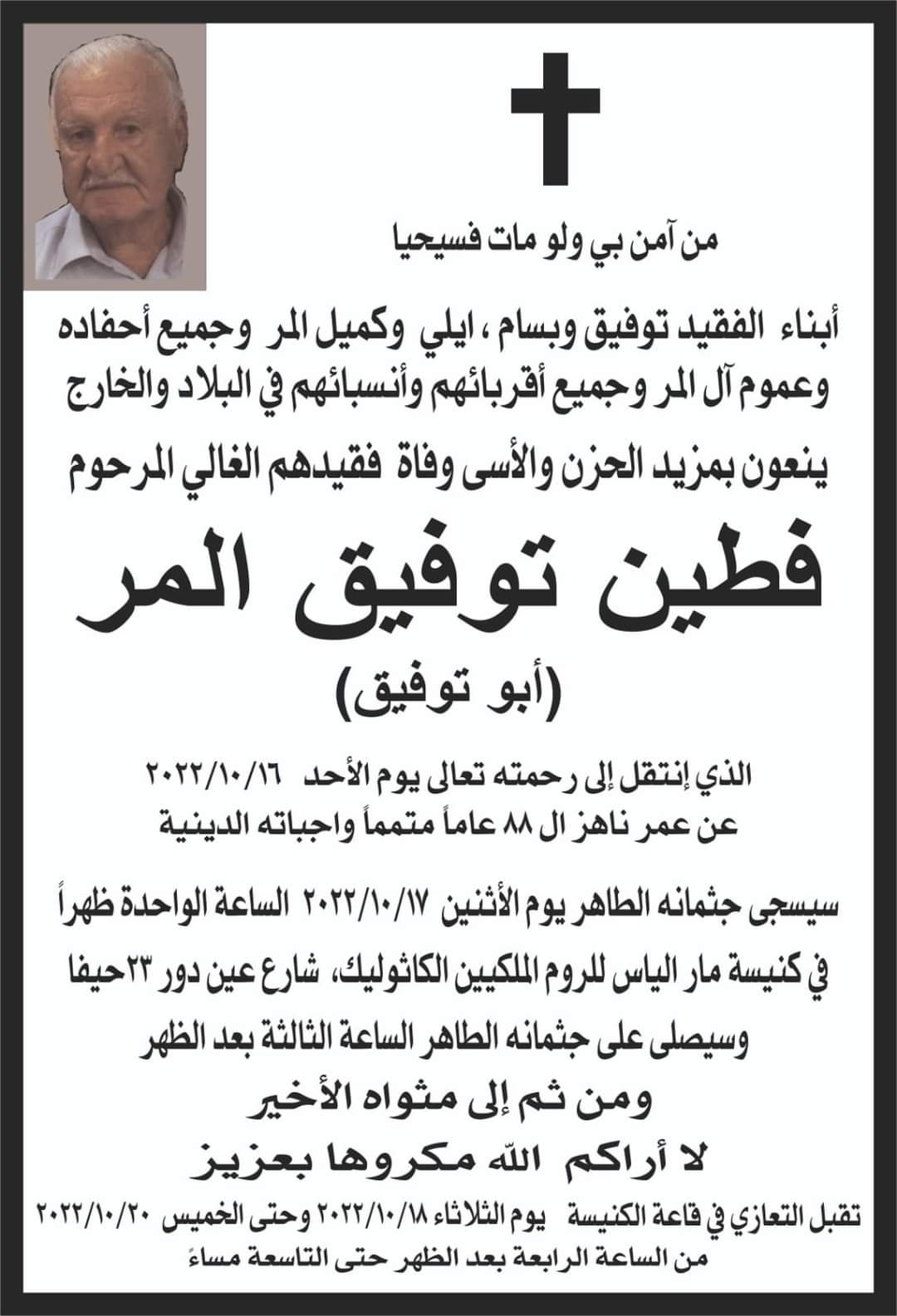 حيفا: وفاة الفاضل فطين توفيق المر