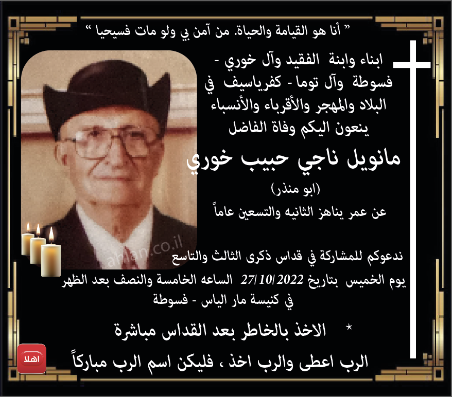فسوطة: وفاة الفاضل مانويل ناجي حبيب خوري في استراليا