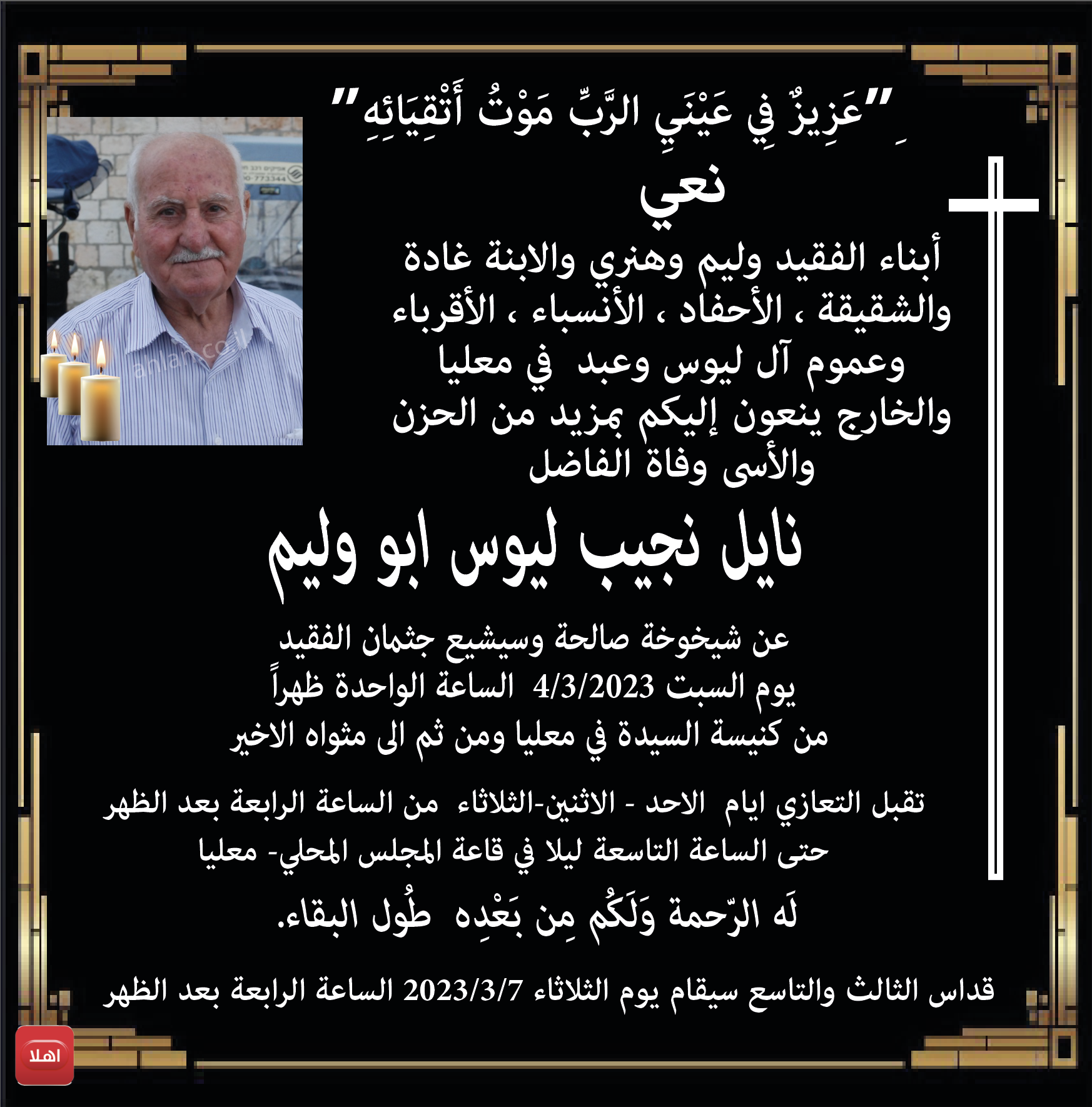 معليا: وفاة الفاضل نايل نجيب ليوس ابو وليم