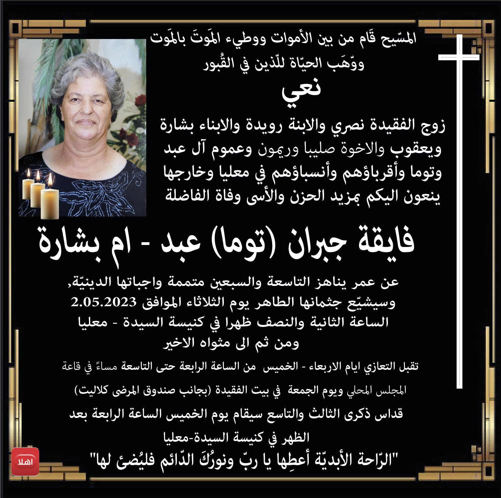 معليا- وفاة الفاضلة فايقة جبران توما عبد ام بشارة