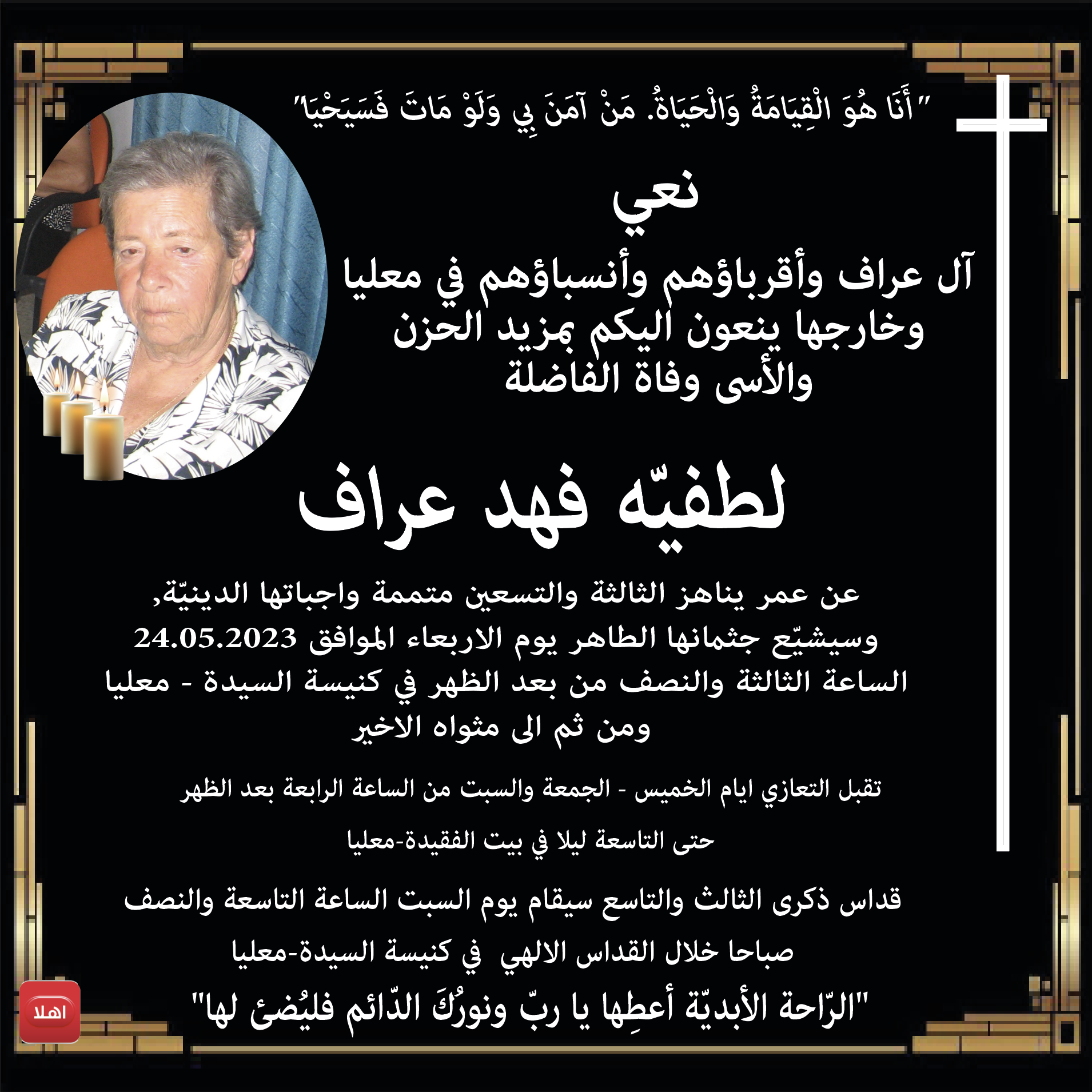 معليا- وفاة الفاضلة فايقة جبران توما عبد ام بشارة