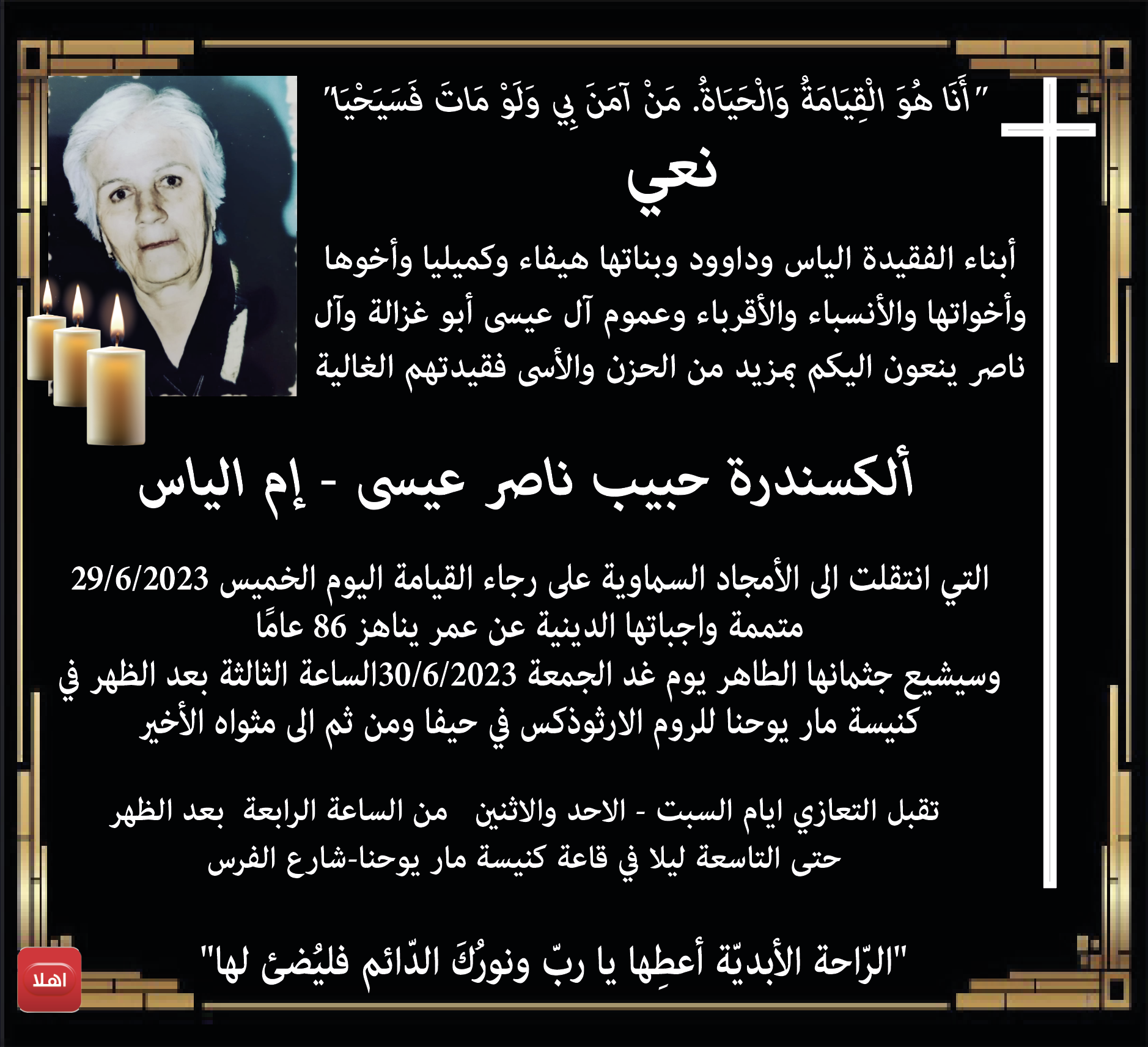 حيفا-كفرسميع: وفاة الفاضلة الكسندرة حبيب ناصر عيسى ام الياس