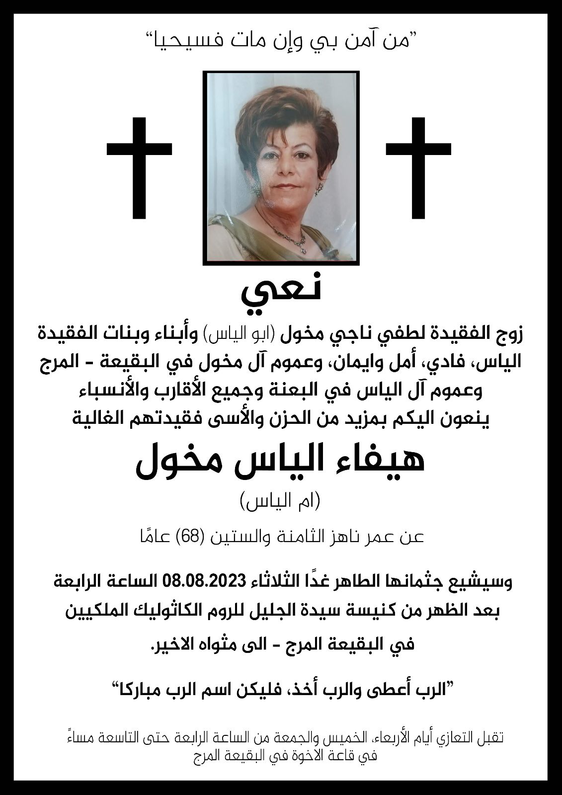 البقيعة-المرج: نعي الفاضلة هيفاء مخول ام الياس