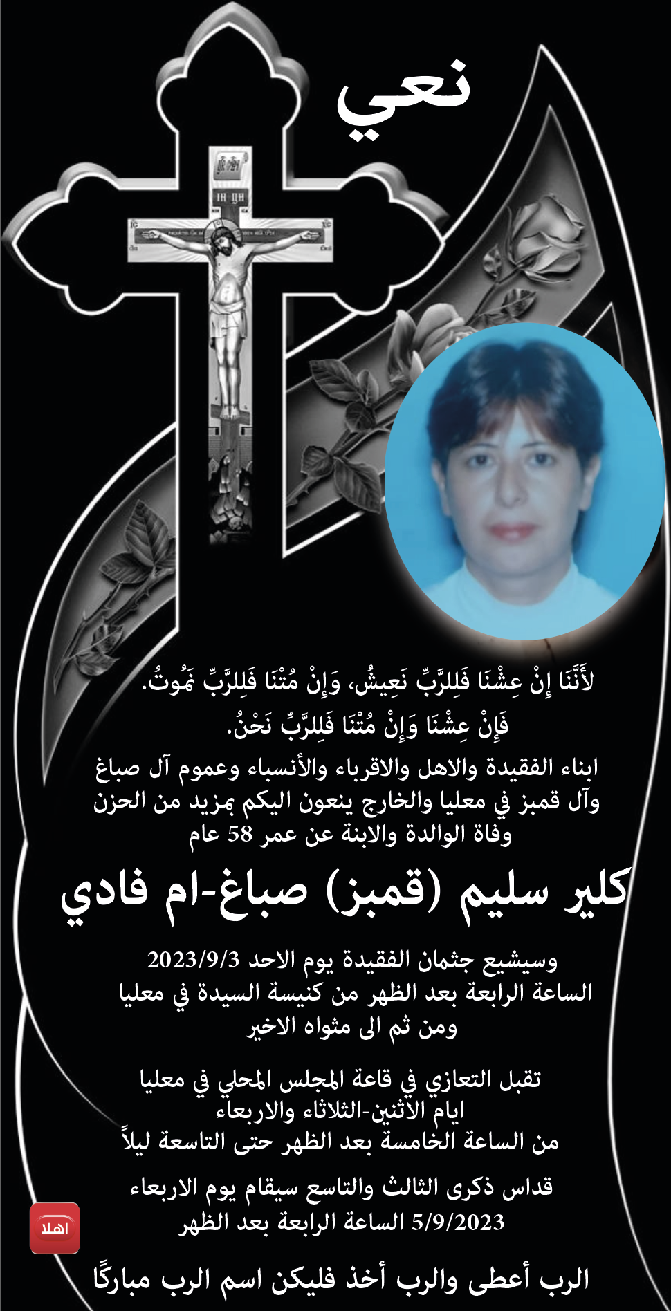 معليا: وفاة الابنة كلير سليم قمبز صباغ ام فادي
