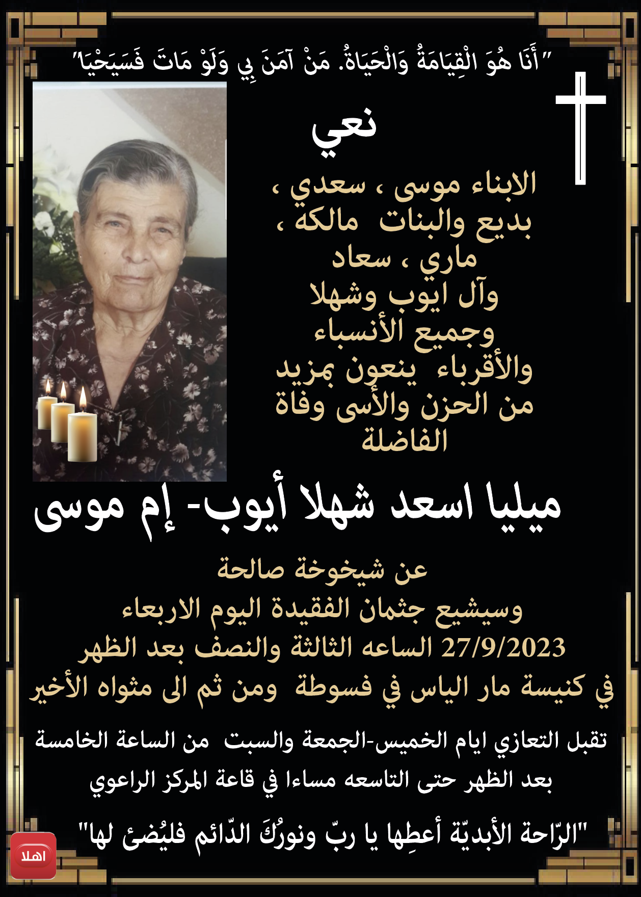 فسوطة:: نعي وفاة ميليا اسعد شهلا أيوب- إم موسى