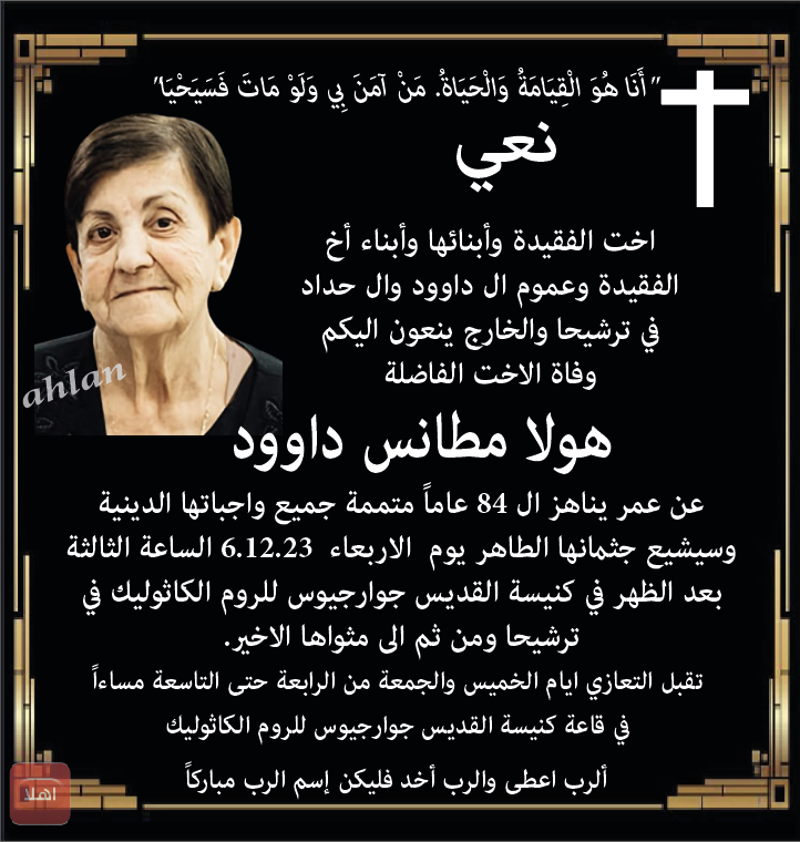 ترشيحا:: وفاة الطيبة الذكر هولا مطانس داوود