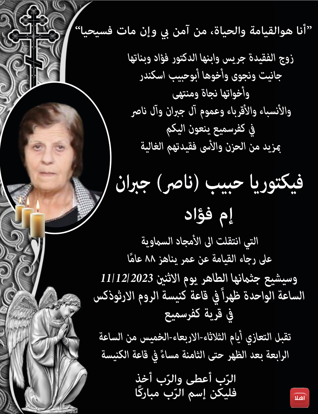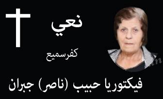 كفرسميع: وفاة الفاضلة فيكتوريا حبيب ناصر جبران