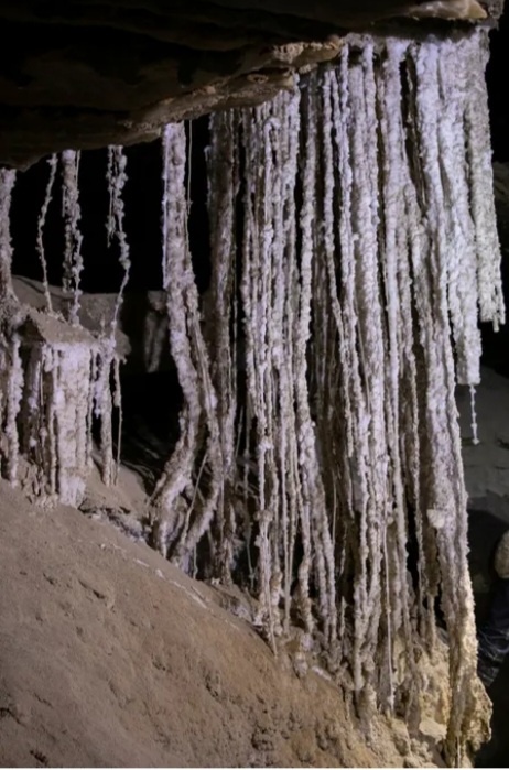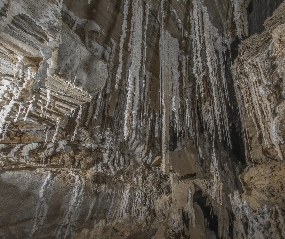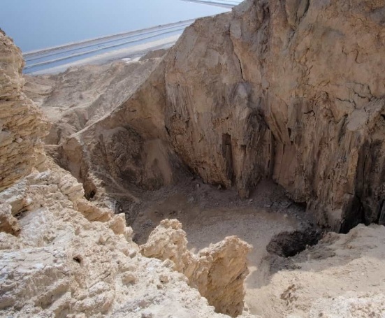 لأنّ الملح سريع الذوبان في الماء فقد عملت الأمطار القليلة في زمن طويل ما يشبه العمليّات الكارستيّة، فقد عملت المياه عدّة اخاديد وحيث توقّفت المياه في المنخفضات الموجودة في الجبل بدأت تذيب الملح مكوّنة حفَرًا أخذت تتعمّق عامًا بعد عام مكوّنةً آبارًا عميقة لتخرج منها المياه بشكل افقي إلى البحر، وهكذا تكوّنت المغاور ذات (المداخن)، ولعلّ اشهر هذه المغاور وأكبرها مغارة سدوم، التي يعلو مدخلها عمود صخري سمِّي (زوجة لوط)، لتكريس ما جاء في قصّتها بان الإله عاقبها إذ عصت أمره بألّا تنظر إلى الوراء لترى ما يحدث لمدينتها، فحوّلها إلى عمود من ملح.