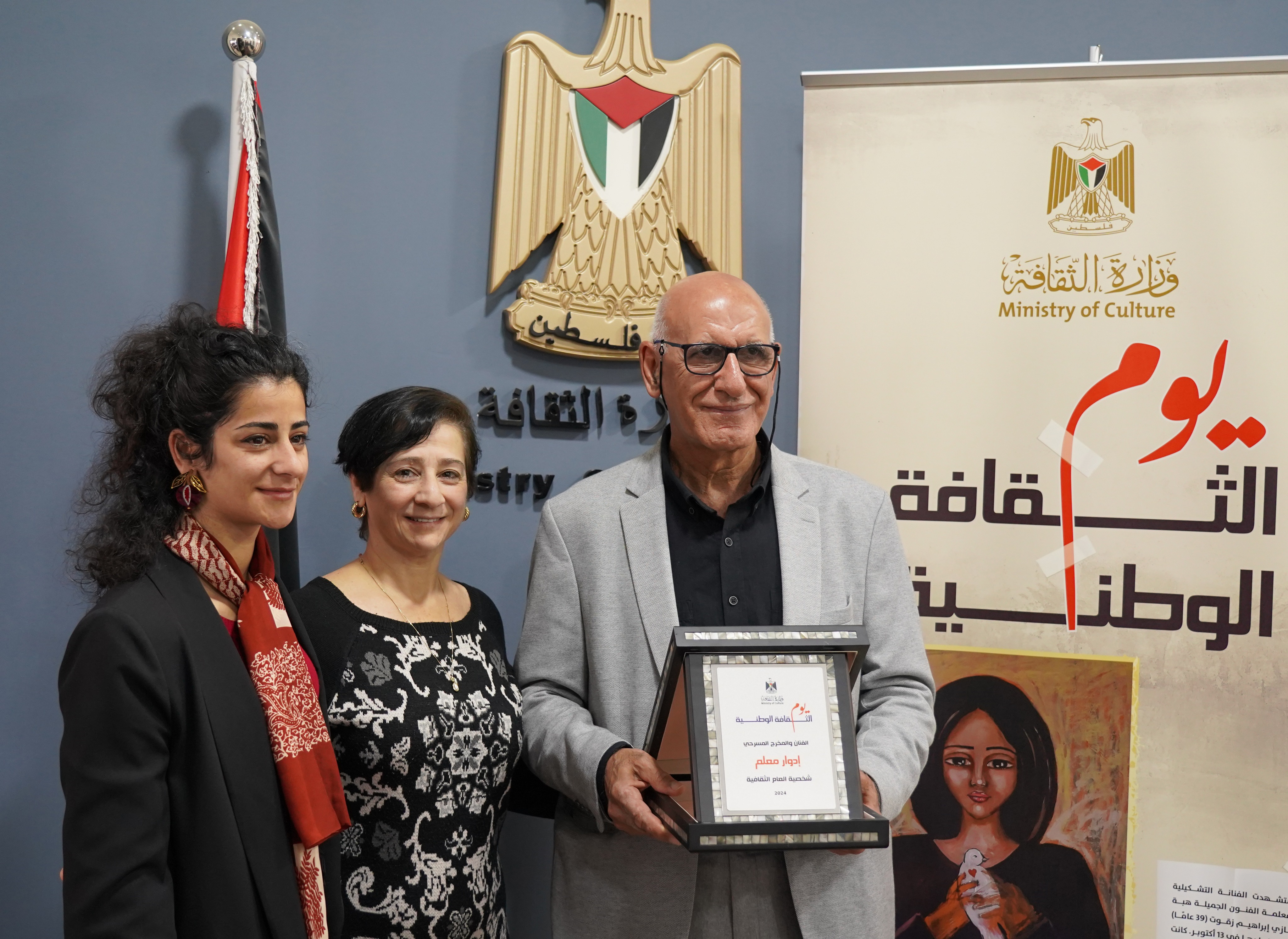 اهلا- الصور خاصة للموقع ليس بالامر البسيط ان يواصل الفنان مسيرة حياته الفنية لسنوات واليوم اعلنت وزارة الثقافة الفلسطينية عن الفنان والمخرج المسرحي إدوارد معلم انه يستحق الحصول على شخصية العام الثقافية للعام 2024 وخلال احتفال رسمي برعاية وزارة الثقافة الفلسطينية اليوم الاربعاء الممثلة بوزير الثقافة عاطف أبو سيف، عن الفنان والمخرج المسرحي إدوارد معلم، شخصية العام الثقافية للعام 2024. وبهذا الاعلان الذي تم دراسته من قبل العديد من الجهات الثقافية الفلسطينية مسيرة الحياة والانتج الفني للفنان معلم , مخرج العديد من الافلام والمسرحيات التي احتلت مكانا مرموقا في الوسط المحلي والعالمي والفلسطيني بشكل خاص. الفنان معلم المولود في قرية معليا الجليلية العام 1958، وأحد أبرز مؤسسي فرقة الحكواتي المسرحية العام 1977، التي قدمت عروضا واسعة في بلادنا ومسرح النزهة الحكواتي في العام 1984. من هنا استطاع الفنان معلم ان يحتل مكانة خاصة في قلوب الناس ومتابعيه . الفنان ادوار معلم بكلمات الشكر الى وزارة الثقافة ممثلة بالوزير عاطف أبو سيف على هذا التكريم، قائلاً وموجها شكره الى جميع الزملاء وإن هذه الجائزة هي من حق جميع العاملين في المسرح الفلسطيني . ولم ينس ان يوجه شكره العميق لجميع الفنانين والفنانات والفنيين الذين عملوا معه خلال مسيرته المهنية الطويلة، التي لم تخلو من التحديات أما على خشبة المسرح أو خلف الكواليس.
