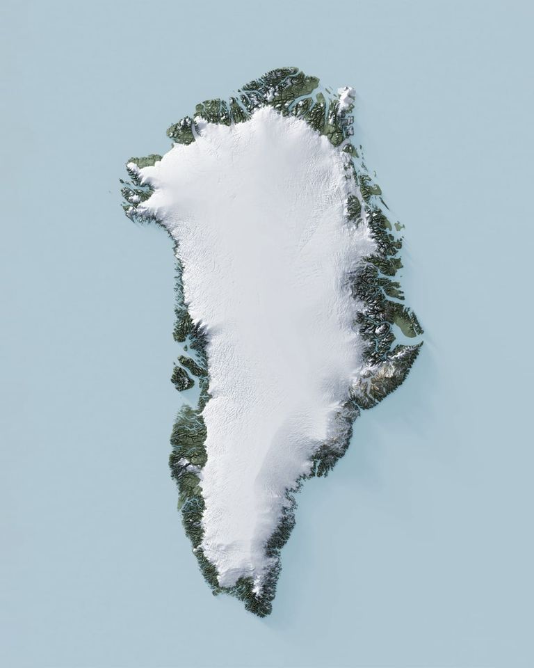 تُغطى معظم جرينلاند (حوالي 80%) بالغطاء الجليدي الدائم، مما يجعلها ثالث أكبر كتلة جليدية في العالم بعد القارة القطبية الجنوبية وغرينلاند.