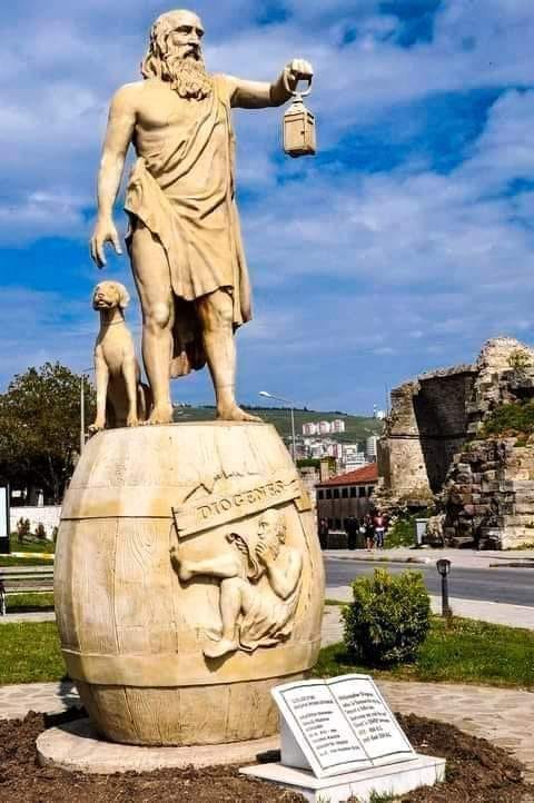 هذا الرجل اسمه "ديوجين الكلبي" ولد سنة 413 قبل الميلاد، في مدينة سينوب التركية، وسمي الكلبي لان الكلب كان شعار الجماعة الفلسفية التي اسسها، كان يؤمن أن الحكمة لا تتحقق إلا بالحرية، وخلاصة مدرسة الكلبيين الفلسفية أن العلم النظري لا معنى لوجوده، فالعلم العملي هو وحده الذي يجب ان يؤمن به الانسان، وان هدف الفلسفة ان تسلح الانسان بالفضيلة التي تؤدي إلى السعادة والتي هي غاية الحياة، والفضيلة هي الخير الوحيد، مثلما أن الرذيلة هي الشر الوحيد