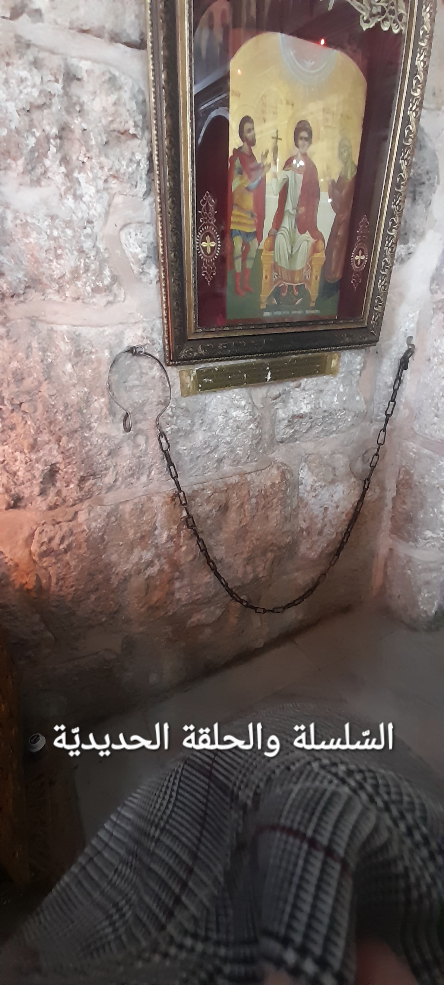 في الزاوية الشّماليّة الشّرقيّة سلسلة حديديّة تنتهي بحلقة بمحيط رقبة، كانت توضع على عنق المرضى النّفسيّين كعلاج، والآن يتبارك بها الناس (يظهر ذلك في صورة مرفقة).