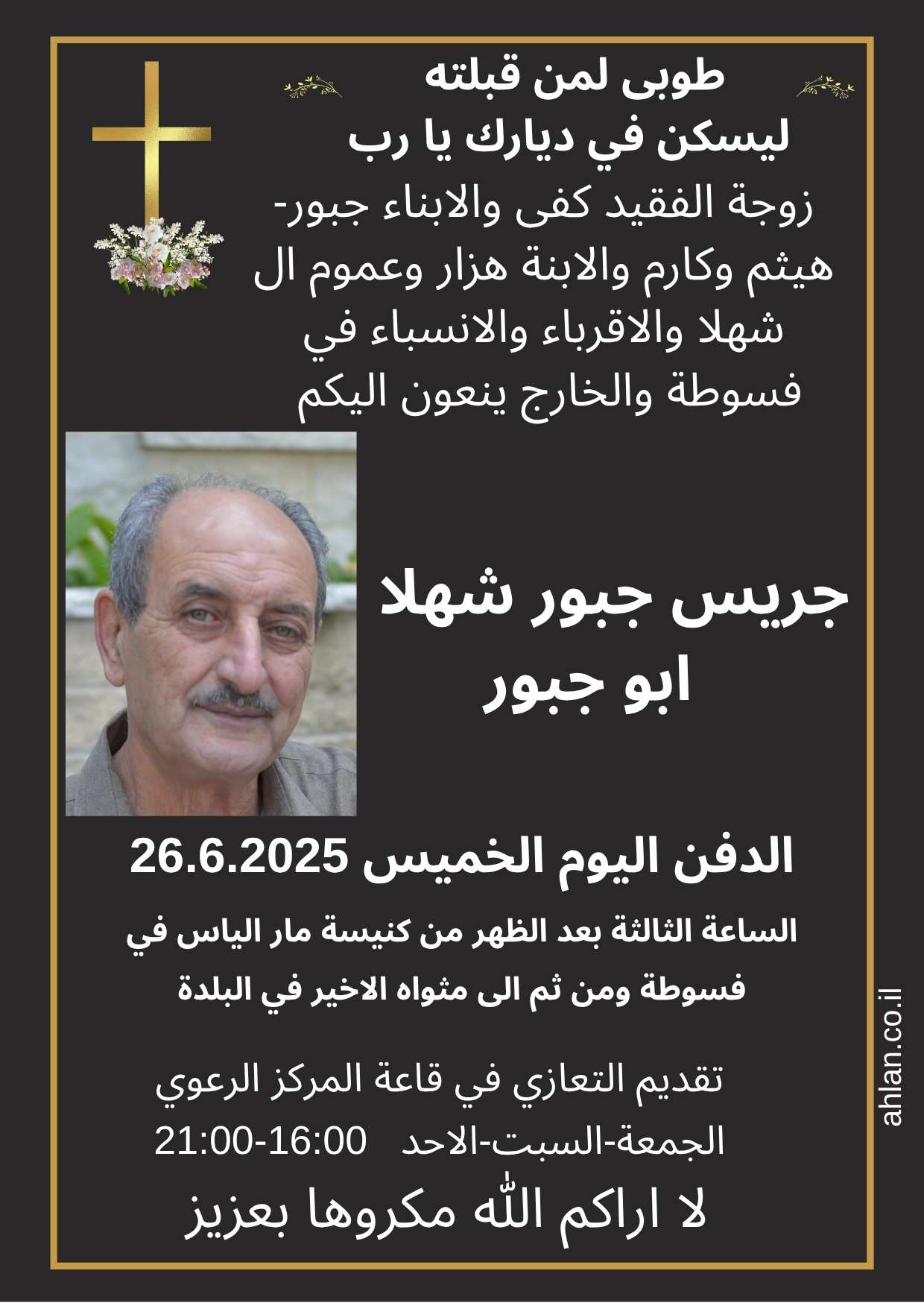 فسوطة: وفاة الفاضل جريس جبور شهلا