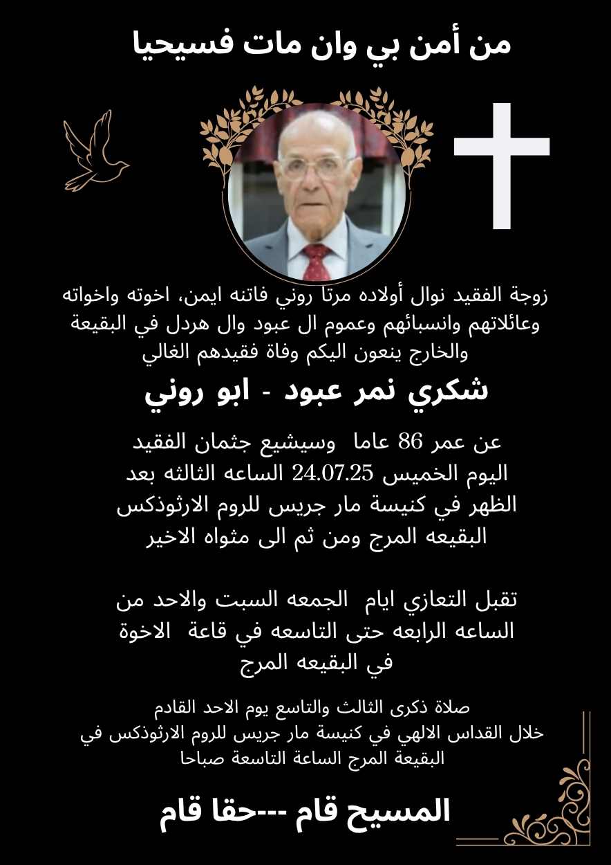 البقيعلة المرج: وفاة الفاضل شكري نمر عبود ابو روني