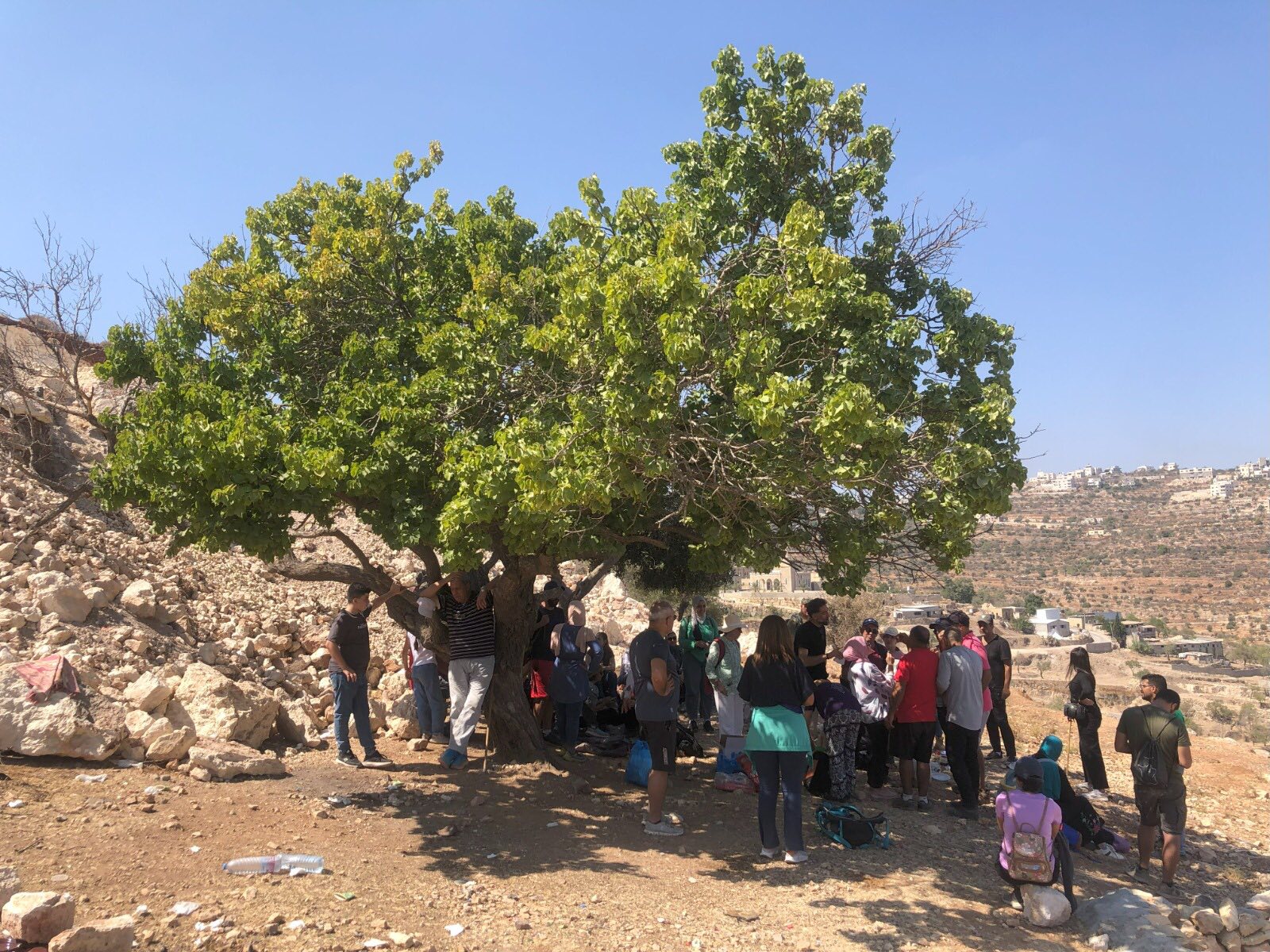 بعد مسار بطول عشرة كيلومترات، وصل الفريق إلى تخوم قرية عبوين، حيث كروم الزيتون واللوز والجوز العملاقة التي تحتضن الأرض كأذرع أبدية. تحت ظلال شجرة مشمش معمّرة، استراح المشاركون لالتقاط الصور التذكارية، وكأنهم يحيون طقوس الأجداد من جديد.