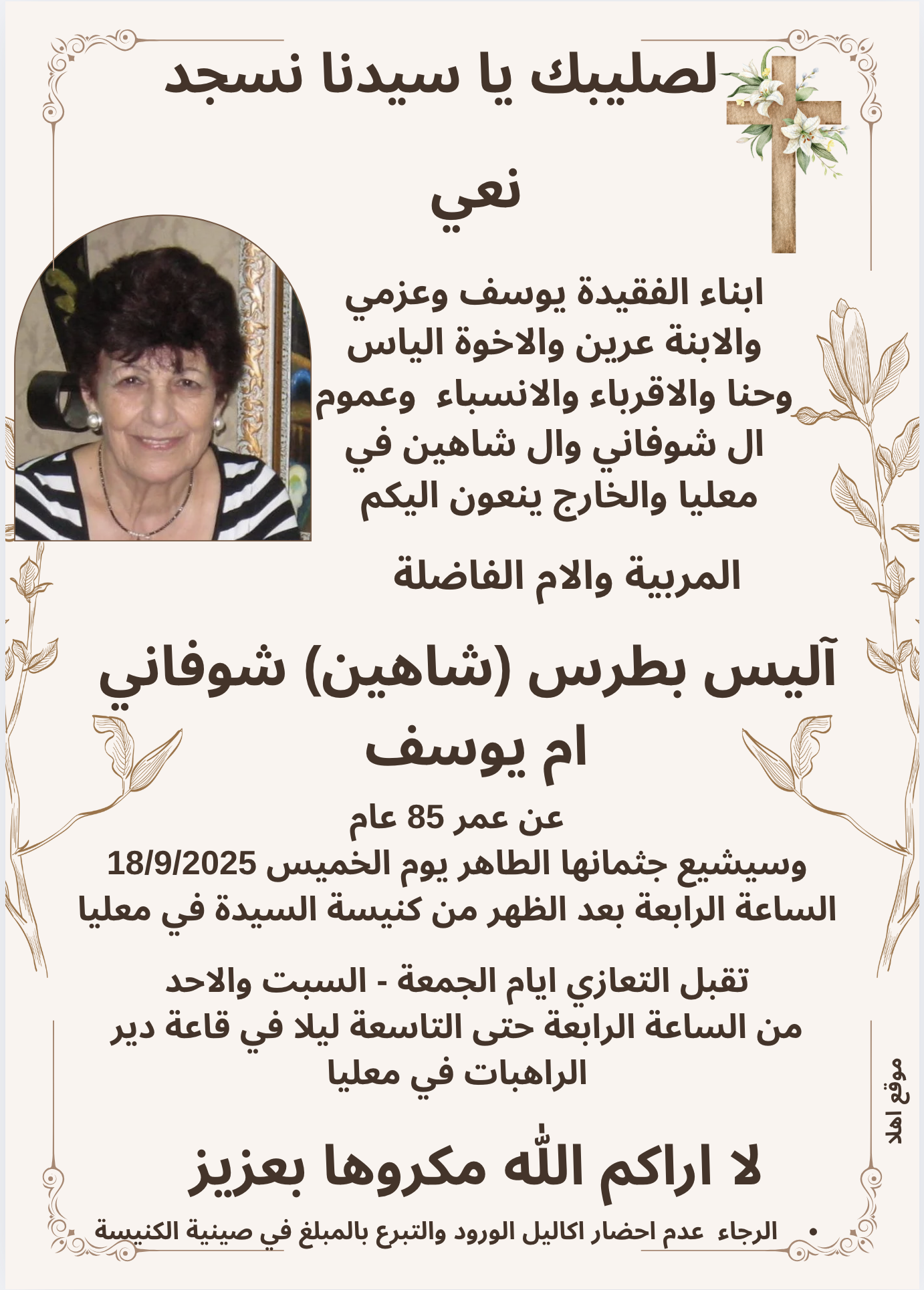معليا: وفاة الفاضلة المربية اليس شوفاني ام يوسف