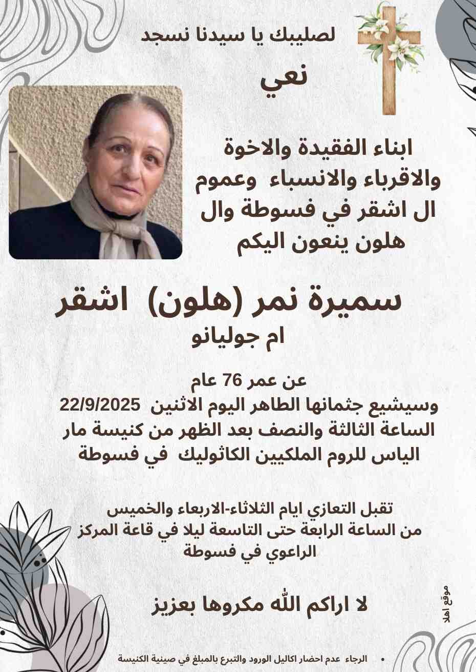 فسوطة: وفاة الفاضلة ام جوليانو سميرة اشقر