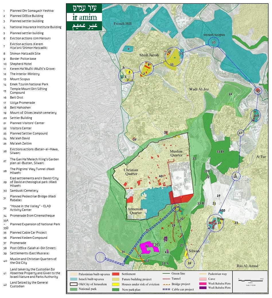 2. والاستيطان الإسرائيلي حول حوض البلدة القديمة، مع إبراز الإخلاءات التي طالت الفلسطينيين، المستوطنات القائمة، مواقع الاستيطان السياحي، المساحات الخضراء والحدائق الوطنية.