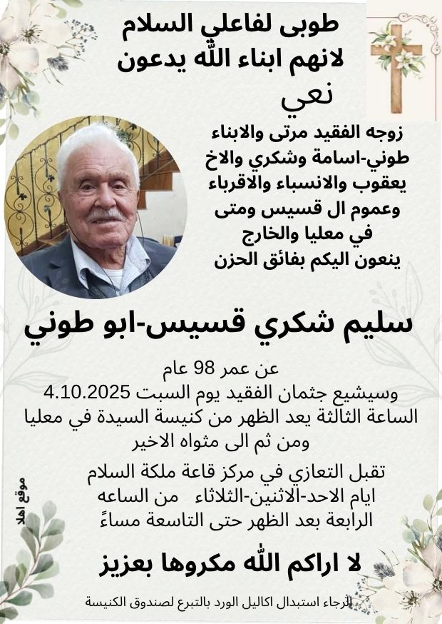 معليا: وفاة الفاضل سليم شكري قسيس ابو طوني