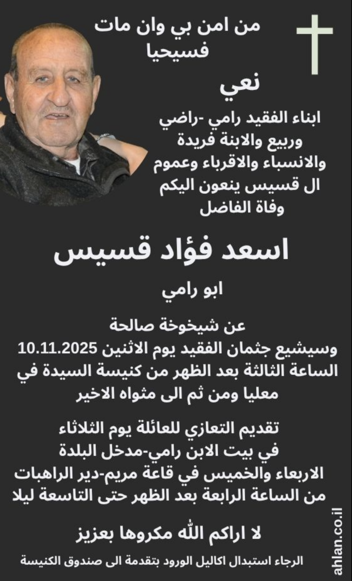 معليا : وفاة الفاضل اسعد فؤاد قسيس ابو رامي
