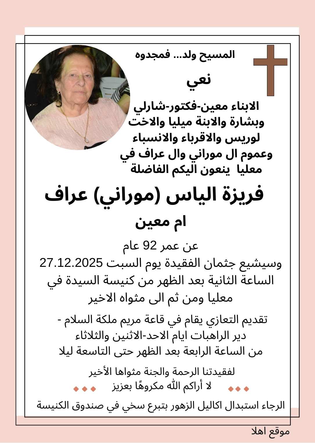 معليا: وفاة الفاضلة فريزة عراف ام معين