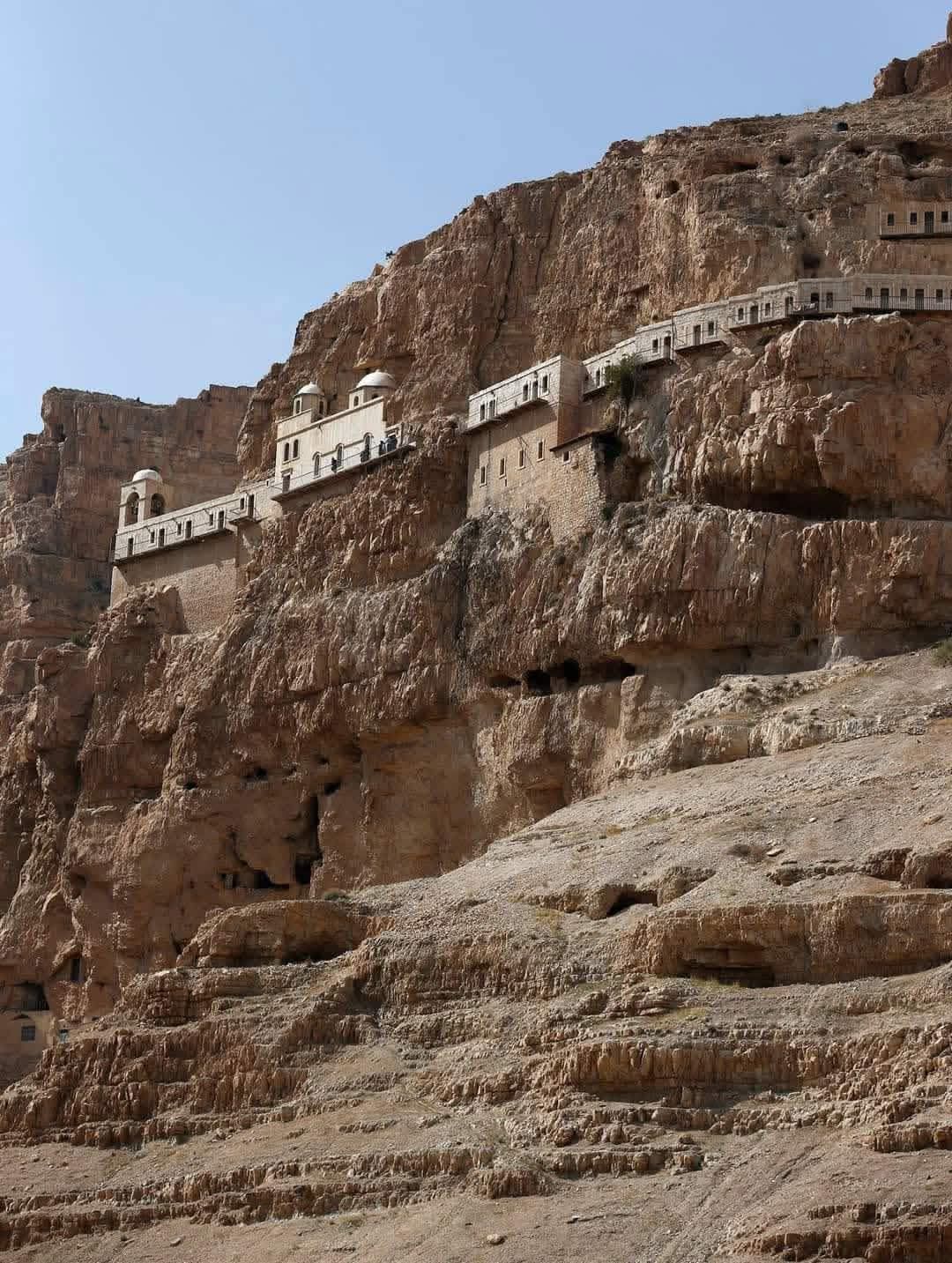 الى بطن الجبل، تصل الطريق الوعرة، الشديدة الانحدار... على خطى السيد المسيح، في تلك البرية حيث اعتزل فيها وصام، قاهرا الشيطان. السلّم الصغير داخل الكنيسة المزينة بايقونات جميلة اثرية، يقود الى كهف. وفقاً للتقليد، "فيه امضى 40 يوماً صائماً، مصلياً. وفيه ايضا قال للشيطان: ليس بالخبز وحده يحيا الانسان". وهناك ايضا صخرة، يقال ان المسيح اتكأ عليها خلال احدى تجاربه. على مرمى حجر من القمة، استلقى دير بأسوار منحوتة في الصخر... كأنه يتدلى من السماء. ولا أبهى.