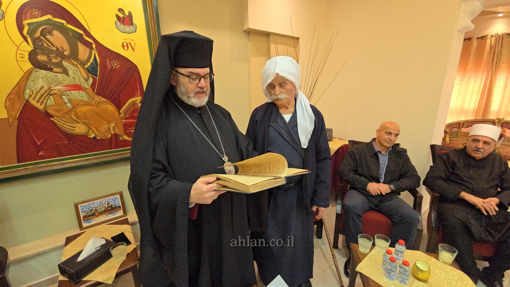 استقبل سيادة المطران يوسف متى الجزيل الوقار، بمعية عدد من كهنة الأبرشية، في دار المطرانية في حيفا، يوم الجمعة 30.1.2026 وفدا من مشايخ ووجهاء طائفة الموحدين الدروز، الذين قدموا له الكتب المقدسة، والتي تم انتشالها من تحت ركام كنيسة بانياس. وتحدث بهذه المناسبة الشيخ يوسف علي سويد من البقيعة، الذي سرد كيفية عثوره على هذه الكتب المقدسة، وقال إنه كان يعمل في إحدى القرى التعاونية في الجليل الأعلى عام 1967، وخرج مع مجموعة من السكان في جولة في الجولان، وعرّجوا على كنيسة بانياس، فوجدوها قد تحطمت نوافذها وأبوابها والدمار منتشر في كل مكان، ووجد على أحد الرفوف بعض الكتب القديمة، فقال في نفسه أود الاحتفاظ بهذه الكتب من الكنيسة. فحملها إلى أحد أساتذة الجامعة في حيفا الذي أكد له أنها كتب مقدسة مسيحية، وتستخدم للصلاة، وبضمنها الإنجيل المقدس. وقرر الاحتفاظ بها في البيت إلى حين تصليح الكنيسة وإعادة استعمالها. وأخبر أبناءه وأحفاده بوصيته للمحافظة على هذه الكتب وتسليمها للمسؤولين في الكنيسة.