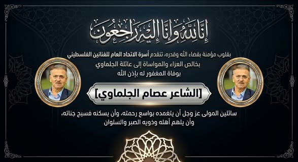 بقلوب مؤمنة بقضاء الله وقدره، ينعى الاتحاد العام للفنانين الفلسطينيين، ببالغ الحزن والأسى، قامةً من قامات الفن الشعبي، وسادناً من سدنة الكلمة الأصيلة، الزميل الفنان والشاعر الكبير: